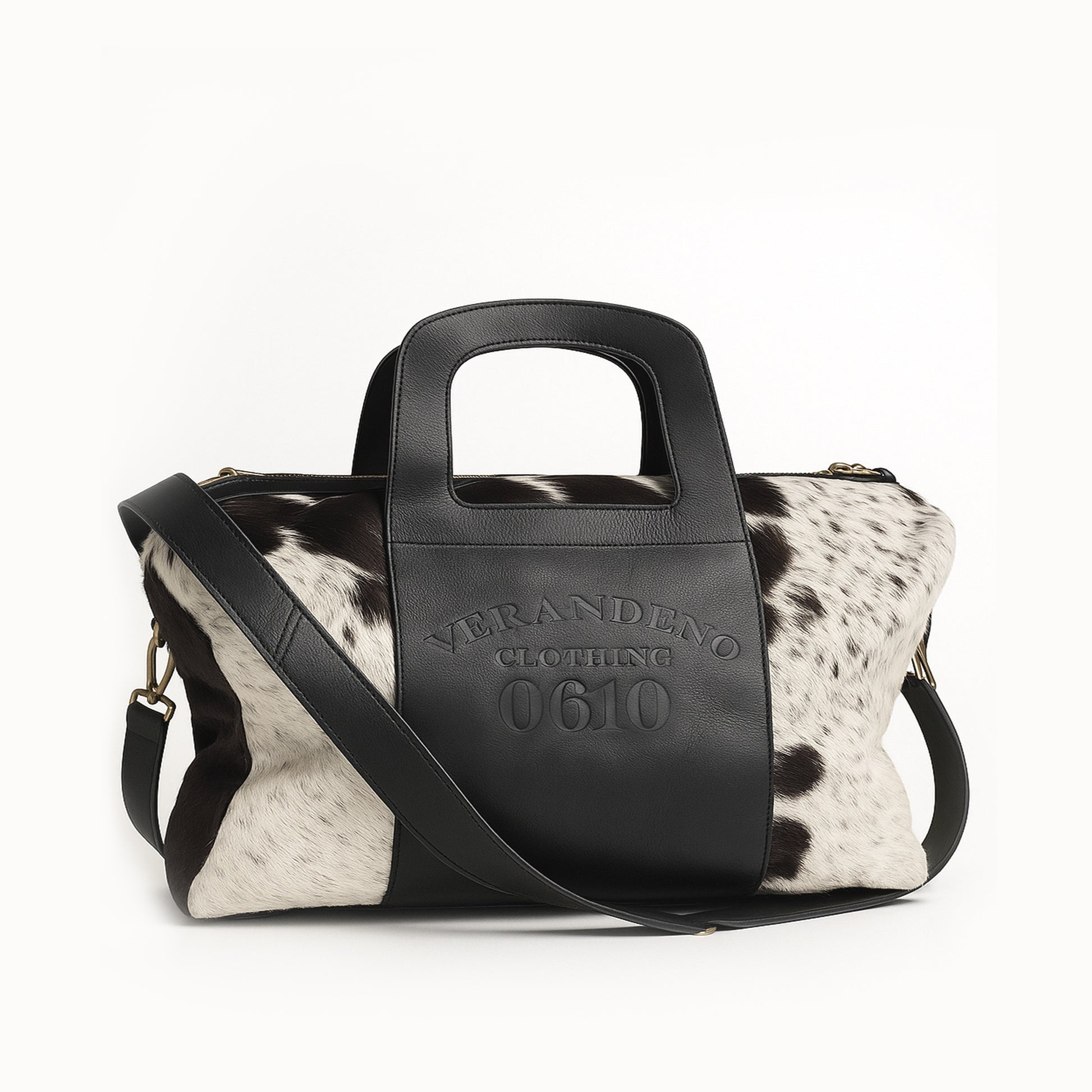 Features: 4 metal rivets on bottom, adjustable leather shoulder strap, inside zip pocket, interior liner, embossed Verandeno design, and signature horseshoe handles.